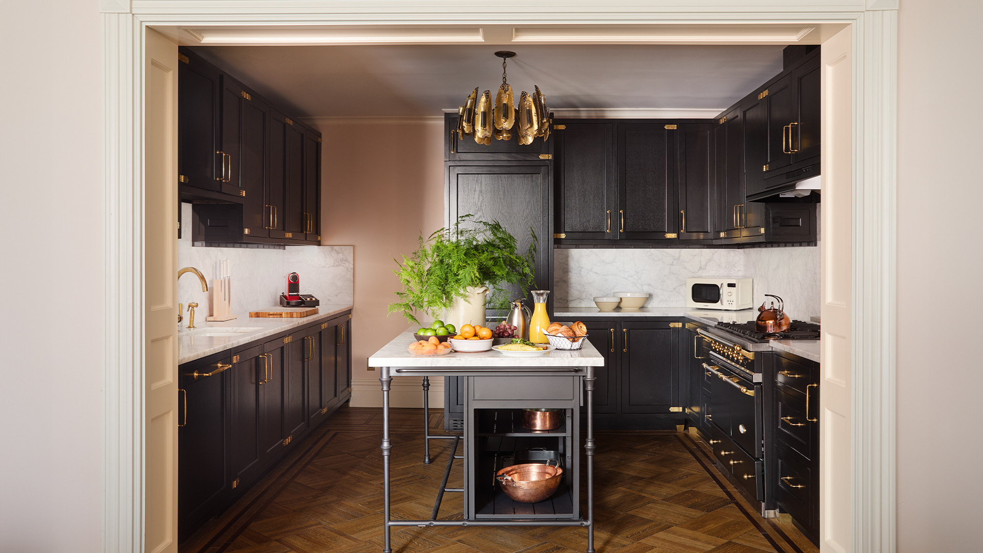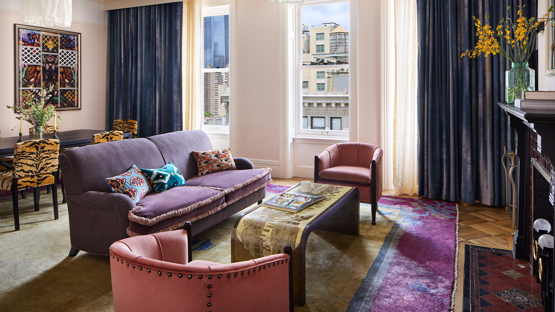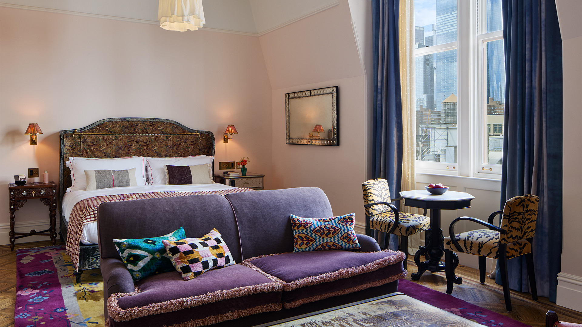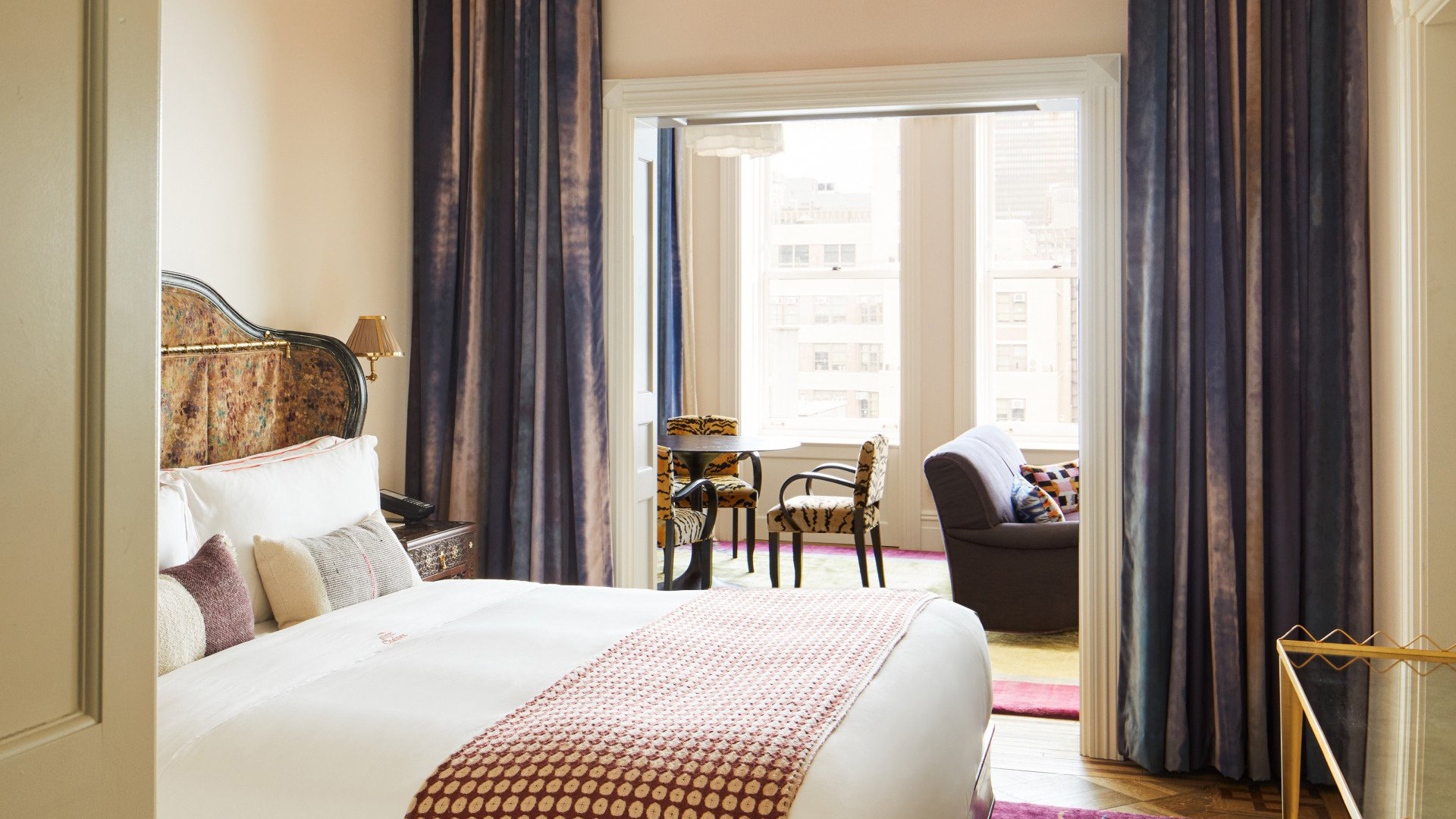 Grand suite with living and dining area, full kitchen, rainfall shower, most with deep soaking tubs, and Manhattan views.