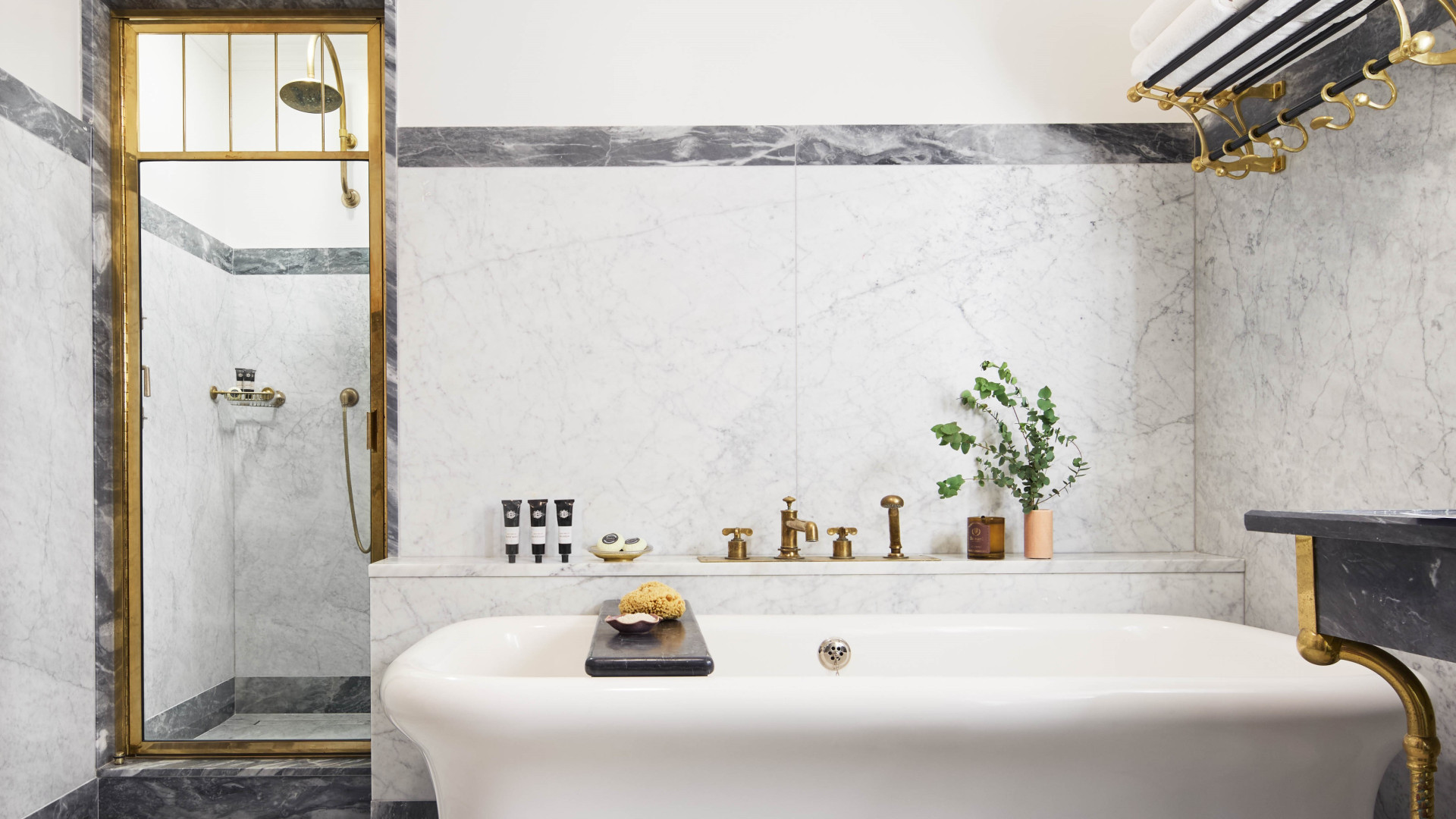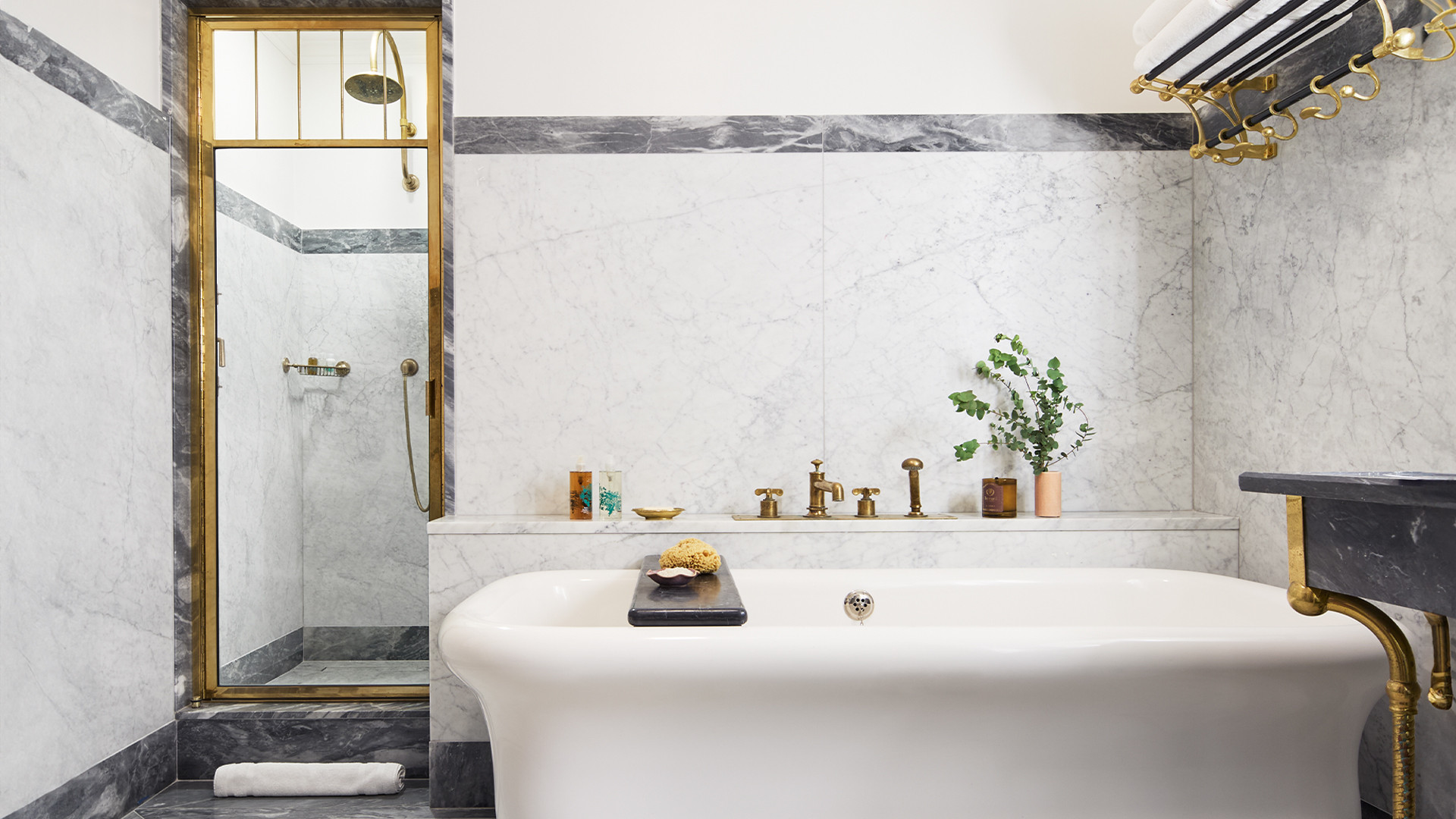 One bedroom suite with living room, rainfall shower, marble soaking tub, balcony,* and Manhattan views.