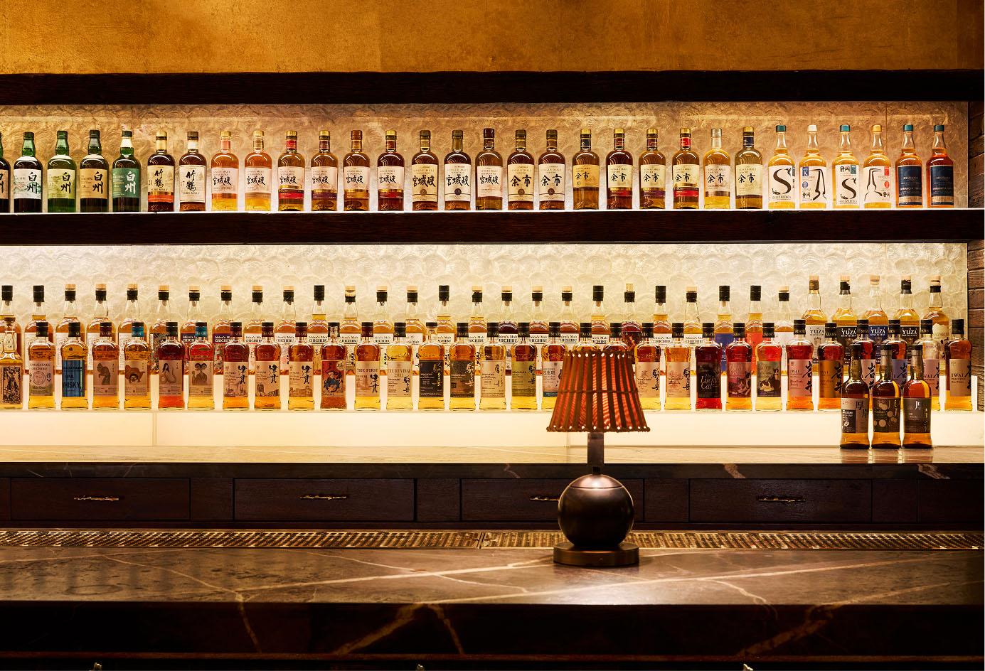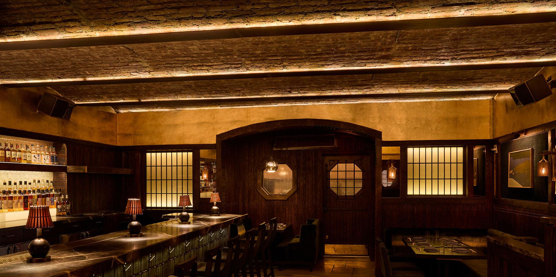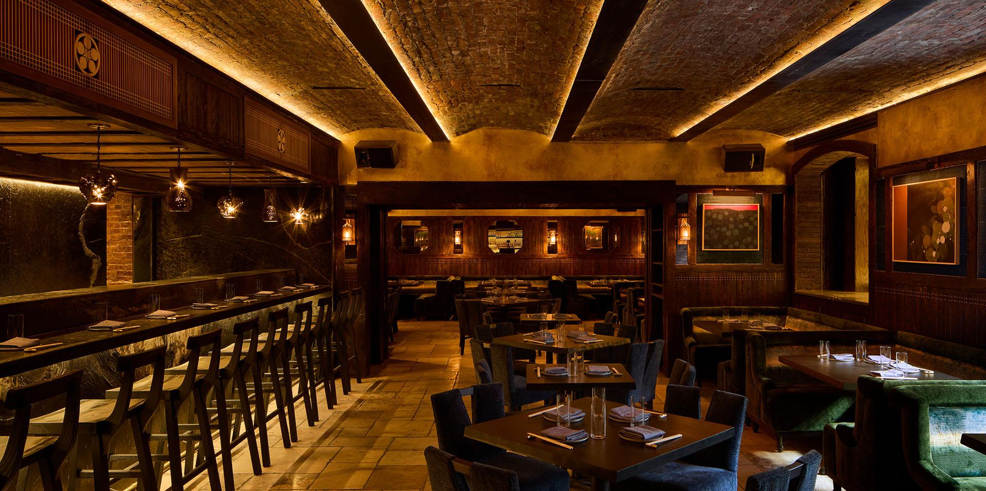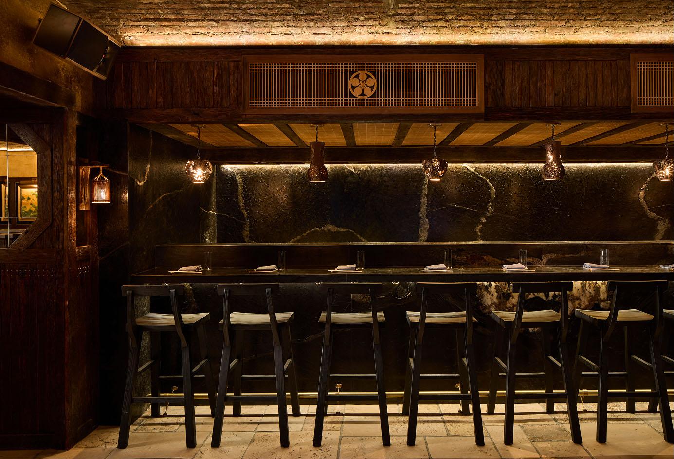 Located in Chelsea's basement space, the decor is anchored by a striking centerpiece, the original backbar from Hotel Okura’s famed Orchid Bar in Tokyo, which was salvaged before renovations and brought to New York. Designed with a reverence for raw materials and wabi-sabi aesthetics, the restaurant’s interiors feature antique limestone floors, salvaged wood walls, and panels of indigo-dyed denim.