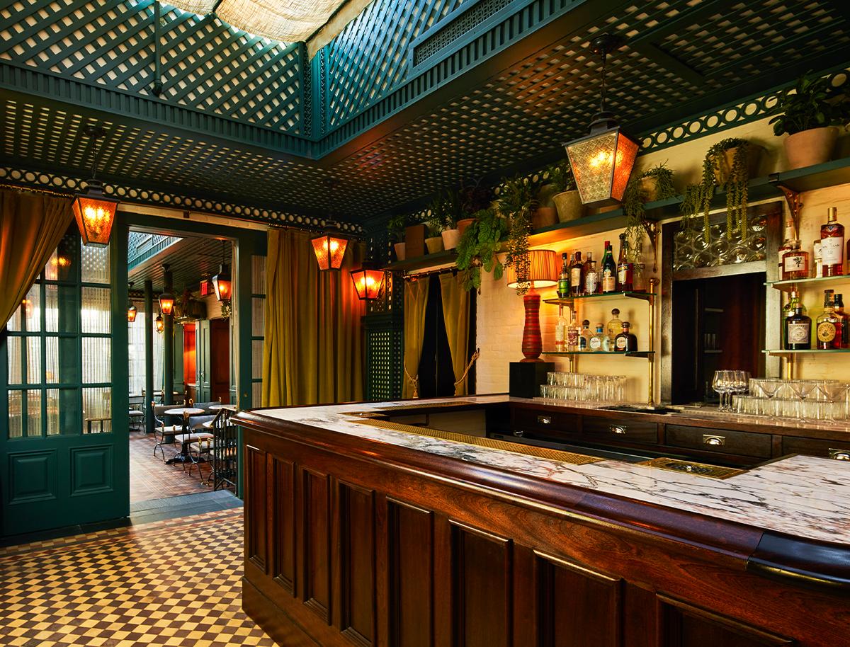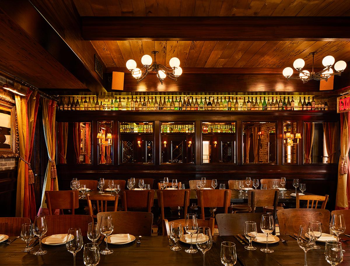 Café Chelsea's private dining space with adjoining private Solarium Bar is suited for dinners up to 32 or standing cocktail receptions up to 50. The Cave à Vin with mahogany paneled walls, brass details and French tiled floor makes for the chicest of dinner parties. The Solarium Bar is a bright and airy space with a glass ceiling, white painted brick and white marble topped bar, the perfect place to gather before dinner.