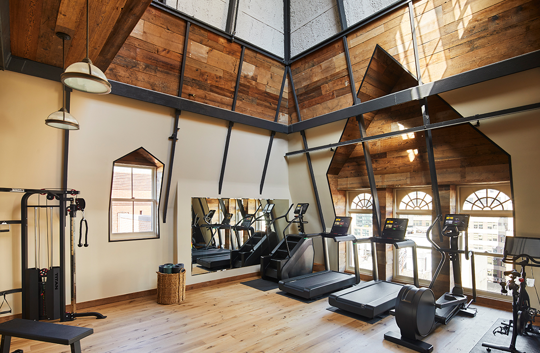 Our gym and fitness studio are tucked within the historic rooftop Steeple, a former residence and artist loft. Located adjacent to the spa, it features reclaimed barn floors, towering 40-foot ceilings, skylights, vast city views, and state-of-the-art equipment. This gym-away-from-home is for everyone: intentionally designed to serve all levels of fitness.